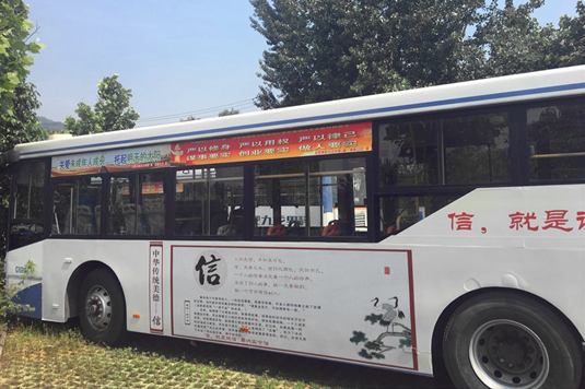主題鮮明的“社會(huì )主義核心價(jià)值觀(guān)”、“文明城市合肥歡迎您”、“學(xué)習黨章黨規”、“三嚴三實(shí)”、“志愿者服務(wù)”等公益宣傳標語(yǔ)顯得十分醒目及靚麗。流動(dòng)中的文明口號和宣傳標語(yǔ),時(shí)刻把文明與和諧透過(guò)良好的服務(wù)傳遞下去,文明服務(wù)是高新公交的責任和追求。