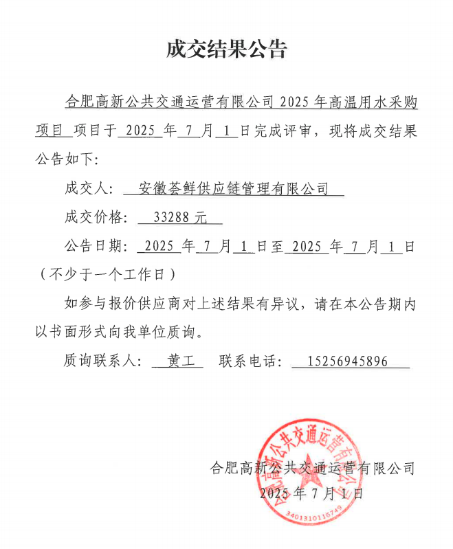 合肥高新公共交通運營(yíng)有限公司2025年高溫用水采購成交結果公告