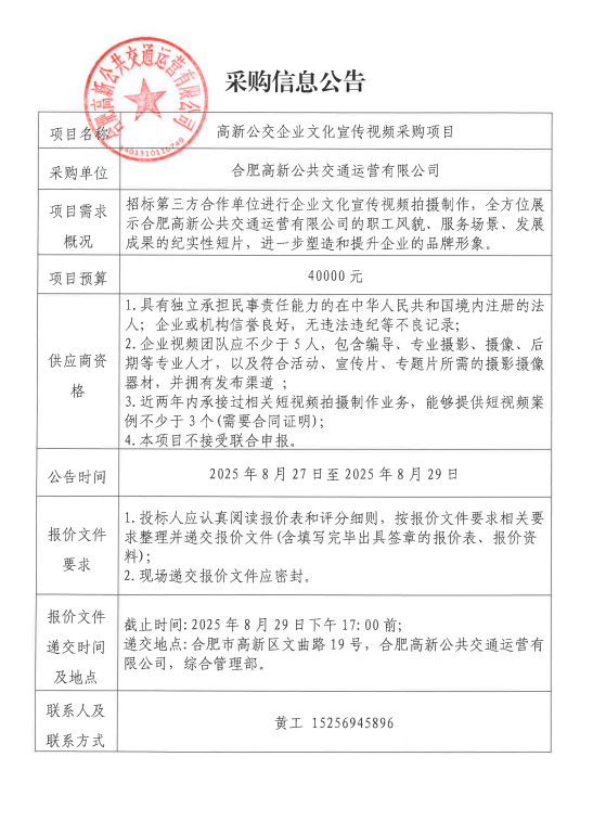 高新公交企業(yè)文化宣傳視頻項目采購信息公告