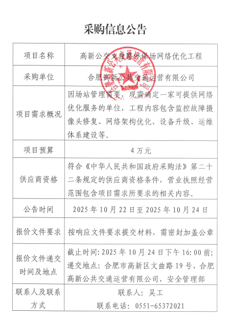 高新公交文曲路停保場(chǎng)網(wǎng)絡(luò )優(yōu)化工程項目采購公告